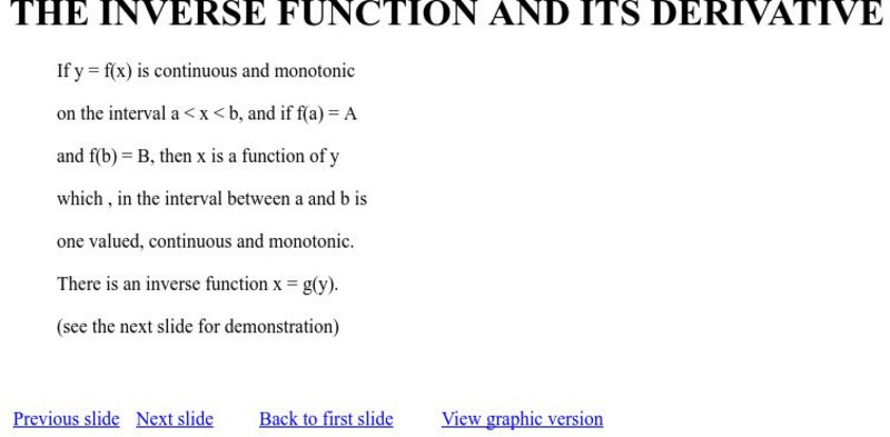 This page from the Virginia Commonwealth University is a slide with a short definition of the inverse function and its' derivative. It provides formulas.