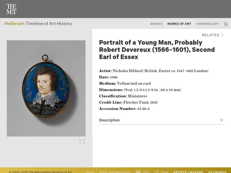 Short essay about one of Hilliard's most famous miniatures (Robert Deveraux, second Earl of Essex?) examines the artist's influences, Tudor symbolism, Elizabeth's relationship with the subject of the portrait, and the romantic ideals of...