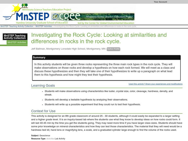 In this activity students will be given three rocks representing the three main rock types in the rock cycle. They will make observations on those rocks and develop a hypothesis on how each rock formed. We will meet as a class and...