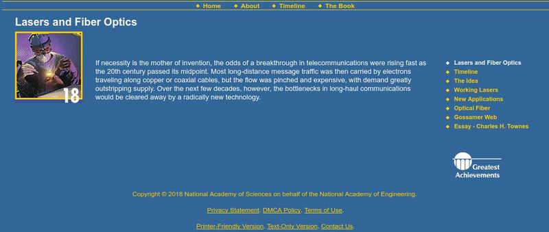 Learners investigate lasers and fiber optics in the 20th century. Some topics explored are working lasers, optical fiber, and the gossamer web. The resource includes historical information, a timeline, and a personal essay by a key...