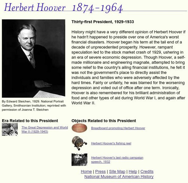 Brief biographical sketch of America's thirty-first president includes background information on the era in which he served and linked-to objects from the Smithsonian's collections that help define the man and his presidency.