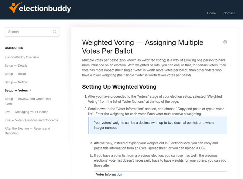 Explains how to set up a weighted voting system for someone organizing an election. Users input their voter list into Election Buddy to set up their system. There is a free trial of the site, but it remains free for a list of fewer than...