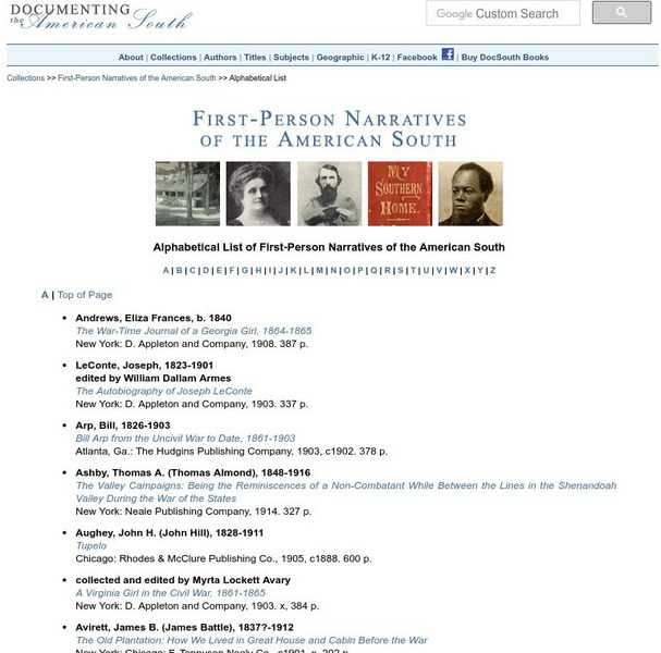 A unique collection of first-person accounts, this concentrates on all the populations of the South, such as ex-slaves, enlisted men, middle-class women, displaced plantation owners. The works are sorted by the author's name. To search...