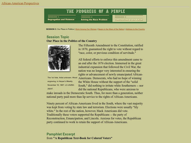 A poem, an address, and a painting that illustrate black political struggle in late-nineteenth-century America. This series of resources characterize "the Negro Problem" as "a concrete test of the underlying principles of the great...