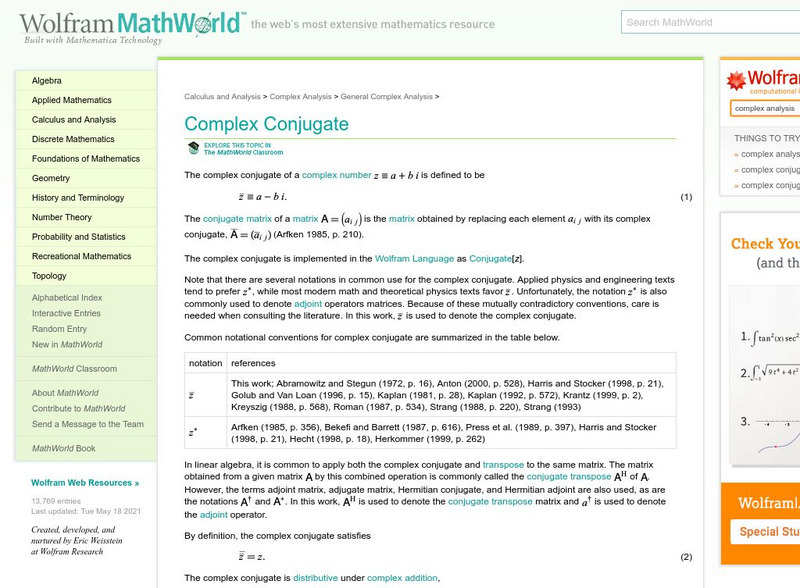 This site contains an explanation of complex conjugates. Then it goes on to list and display charts and formulas. Links are also provided for additional information.