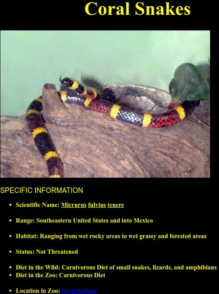 General information on the common Coral Snake from WhoZoo. Various pictures from inside the Ft. Worth Zoo and special adaptations highlight this site.