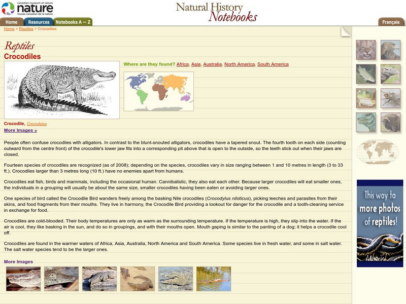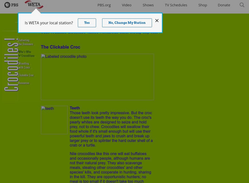 This informative site examines the role of the key parts of the crocodile. It specifically looks at the structure and function of the teeth, feet, tail, nostrils, skin, stomach, eyes, ears, and throat.