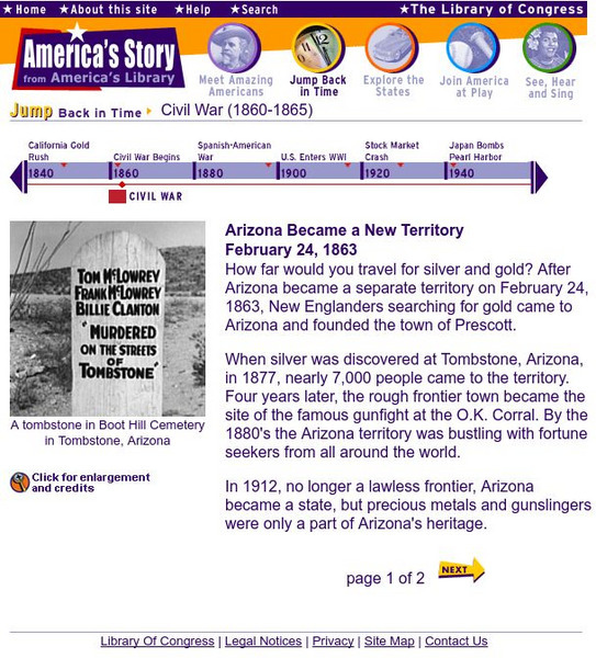 This 2-page article provides information about how Arizona became a new territory on February 24, 1863, and the corresponding silver and gold rush that encompassed the area.