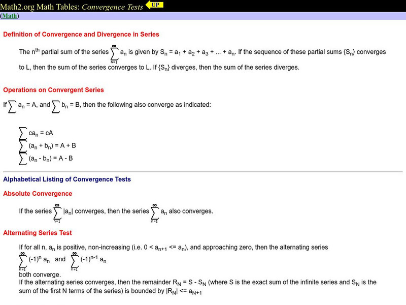 This is an excellent resource! It states all of the most common tests for series convergence. Examples are not included.