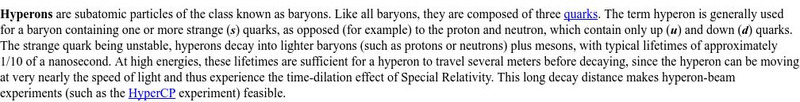 Short and sweet definition and explanation of hyperons in the particle zoo. Nice info about time dilation making hyperon beams useful.