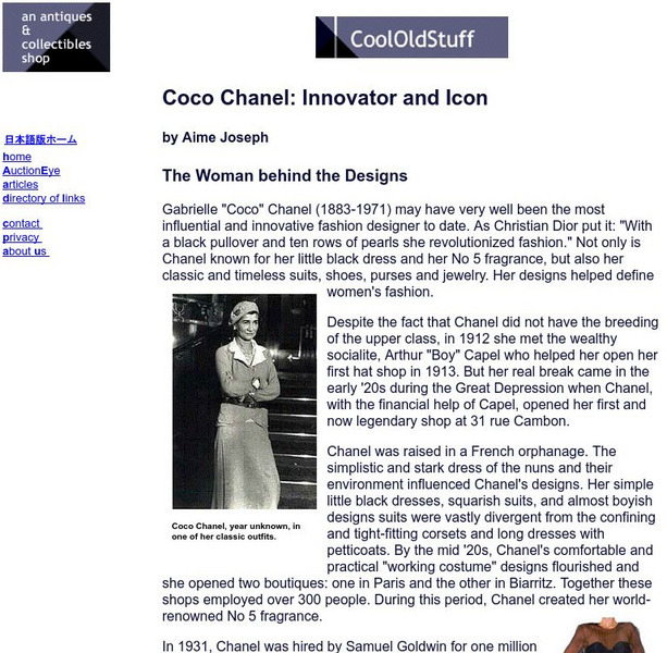 A biography of Coco Chanel (1883-1971 CE) that details the history of her work as well as her life. Provides pictures of her designs.