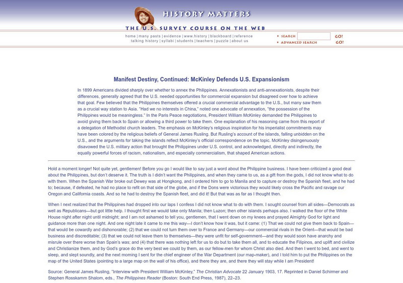 History Matters: Manifest Destiny, Continued: Mc Kinley Defends u.s. Expansionism