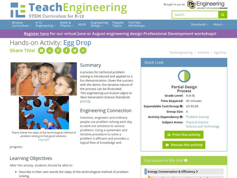 Teams must protect a raw egg from an eight feet fall with a container they designed. To construct the container teams must use only materials given to them in a bag and must do it in an allotted time frame. Lesson plan includes a...