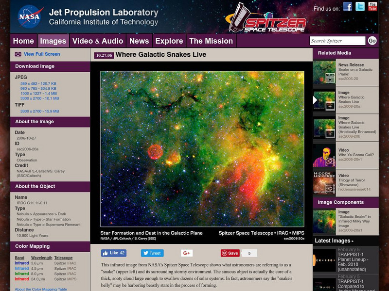 Following the title, "Where Galactic Snakes Live" this site examines an image of "Galactic Snakes" which are actually clouds larger than several solar systems. The text below the image proceeds to explain certain stellar features...