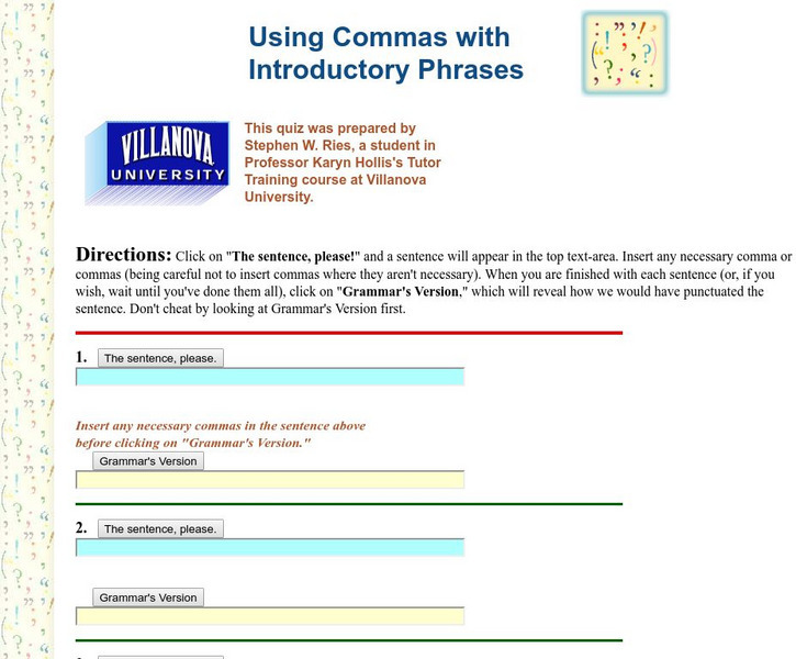 This online quiz from the Capital Community College is tightly focused on commas and introductory phrases. Ten questions ask the reader to insert commas where necessary, then check the sentence against the website's version. Vocabulary...