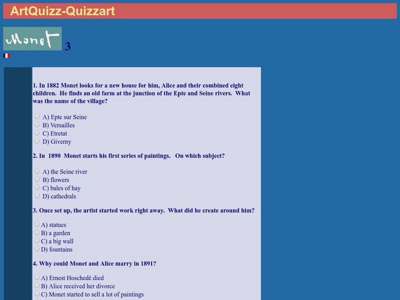 A quiz on the life of Monet. This is a great tool for assessment or review and an even greater way in incorporate technology in the artroom. This site is translated from the original French version. Proof the answers before using for the...