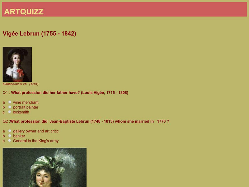 A quiz on the life of Vigee LeBrun, translated into English from the original French. Proof the answers before using this for the first time, as the translation isn't the best. The ArtQuizz homepage uses several different languages.