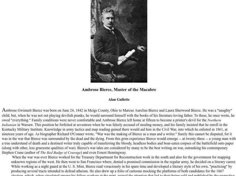 This Ambrose Bierce site features a photograph of Bierce and information about his gothic fiction, The Devils Dictionary, a selected bibliogrpahy, and links to related sites, full texts, and the like.