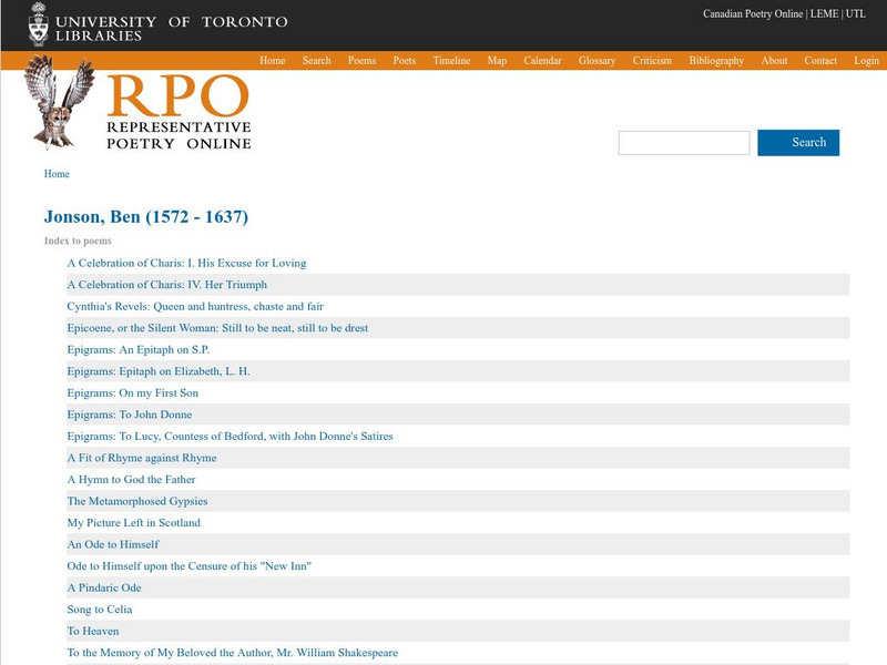 Index page from the University of Toronto offering the complete texts of twenty of Jonson's poems, as well as one work of prose.