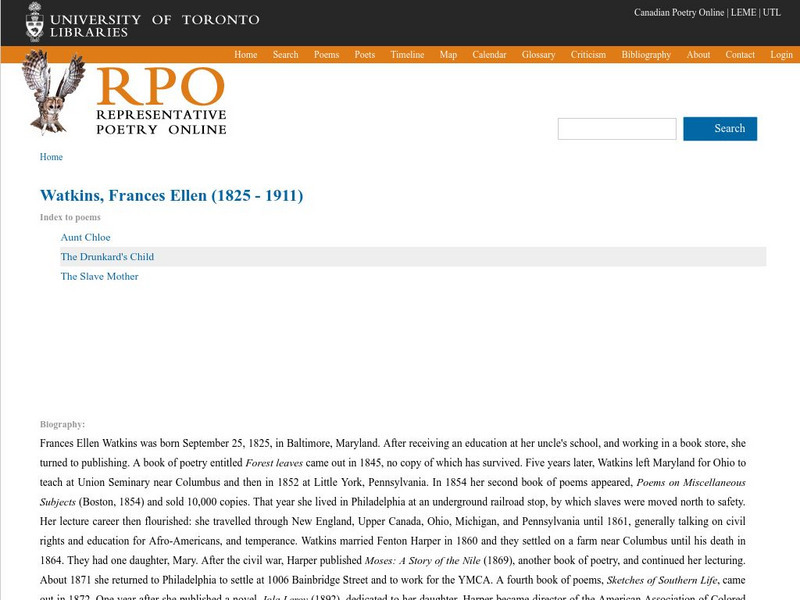 Selected full texts of poems by Frances Ellen Watkins Harper: "Aunt Chloe", "The Drunkard's Child", and "The Slave Mother." Includes overview of the author's life and works.