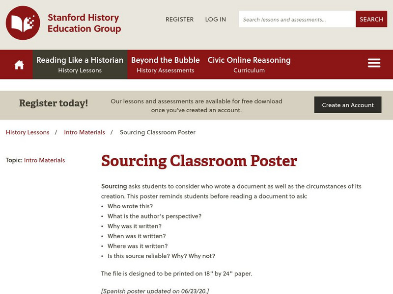 [Free Registration/Login Required] Sourcing asks students to consider who wrote a document as well as the circumstances of its creation. Who authored a given document? When? For what purpose? This poster reminds students before reading a...