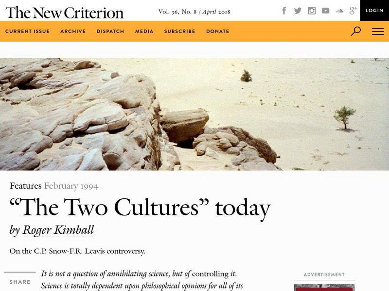 This article appeared in "The New Criterion Online," and addresses not only Snow's book but also the feud between Snow and F. R. Leavis. It provides a helpful overview of Snow's thinking and stature in the literary and scientific worlds.