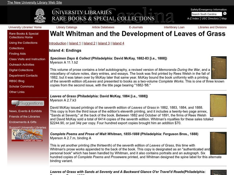 This University of South Carolina site, presented by the Department of Rare Books and Special Collections, chronicles the publication history of Whitman's many revisions of "Leaves of Grass." Includes photographs of rare copies of early...