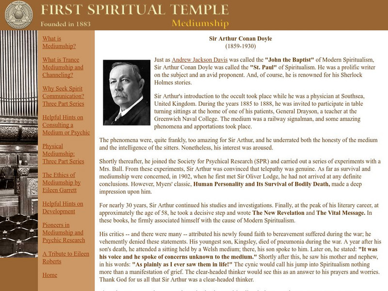 This site, provided by First Spiritual Temple, gives a good look into the spiritual beliefs (mediumship and the channeling of souls) of the author of the Sherlock Holmes stories.