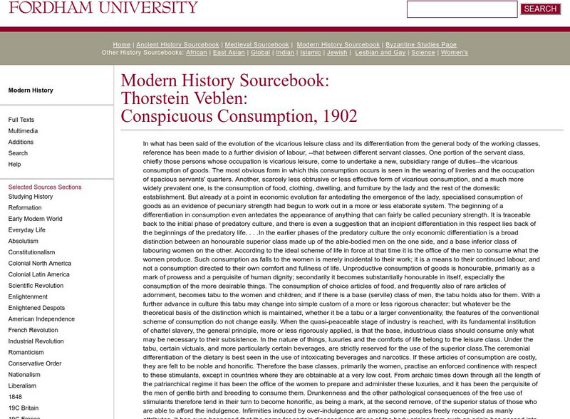 This Fordham University site offers sociologist Thorstein Veblen's views on conspicuous consumption, taken from his work, The Theory of the Leisure Class: An Economic Study on Economic Institutions.