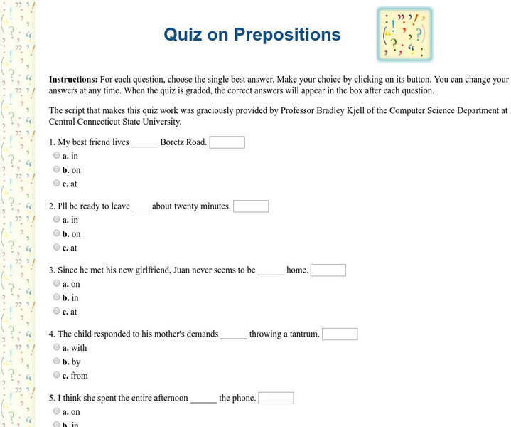 This site from The Internet TESL Journal provides a ten question (English as a second language) tutorial. This test site presents a complete sentence and asks whether there is a correct or incorrect usage of prepositions. Part of a...