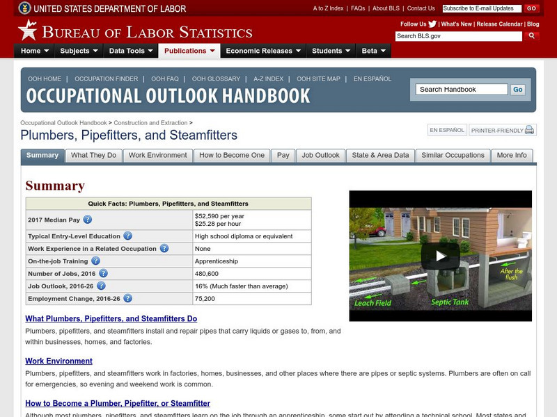 This resource provides occupational information about plumbers, pipelayers, and pipefitters.