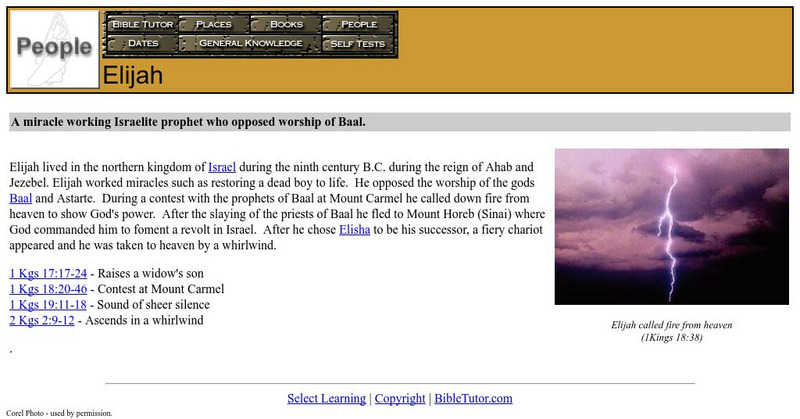 This Bible Tutor site is a very short description of the major contributions of the Hebrew prophet Elijah. This site includes links to scriptural references about Elijah as well as a link to Elisha, his successor.