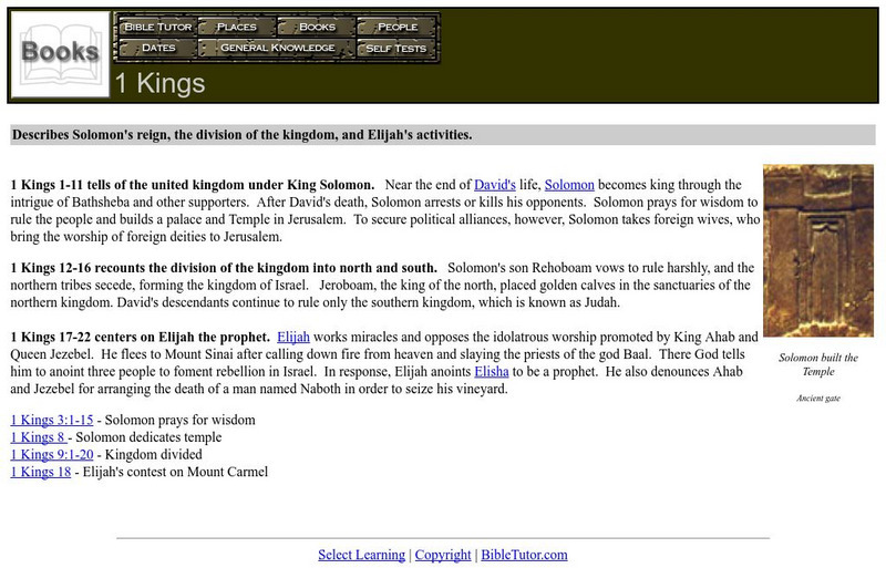 This site from The Bible Tutor provides a very helpful introduction to the book of 1 Kings. This site divided the book into three parts and includes links to relevant subjects.