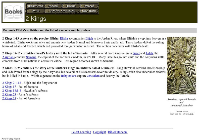 This site from The Bible Tutor offers an excellent introduction to 2 Kings that divides the book into three main sections. There are also links to important Bible verses and links to other relevant subjects.