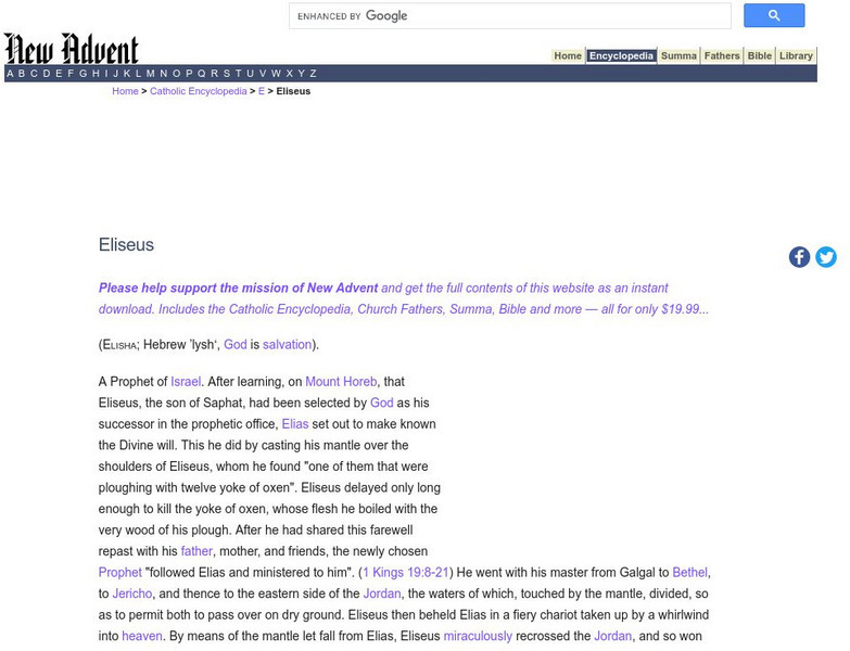 This article profiles the Jewish prophet Elisha. It also examines his teaching and role in the Hebrew Scriptures. Please note that ?The Catholic Encyclopedia? is a historic reference source and should be viewed in the context of resource...