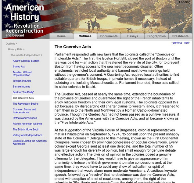 This resource gives a comprehensive account of the Intolerable Acts, why they were passed, colonists' reactions, and particulars surrounding the Massachusetts Government Act and other Coercive Acts with text links and references.