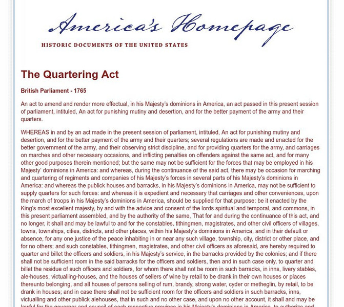 Read the full text of The Quartering Act of the British Parliament in 1765, which required colonists to provide food and shelter for soldiers.