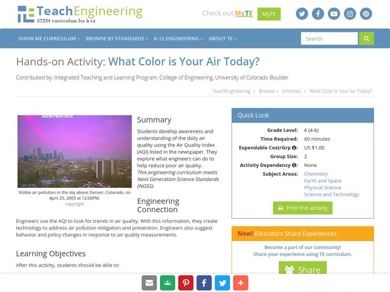 Students develop awareness and understanding of the daily air quality using the Air Quality Index (AQI) listed in the newspaper. They explore what engineers can do to help reduce poor air quality.