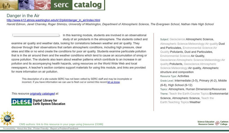 In this learning module, learners are involved in an observational study of air pollutants in the atmosphere. The students collect and examine air quality and weather data, looking for correlations between weather and air quality.