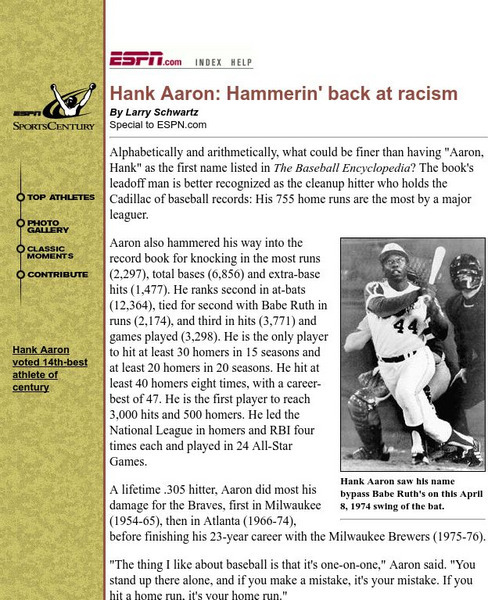 From ESPN, an article describing the career of record-setting home run king Hank Aaron. Along with the records, Aaron received an abundance of racist hate mail.