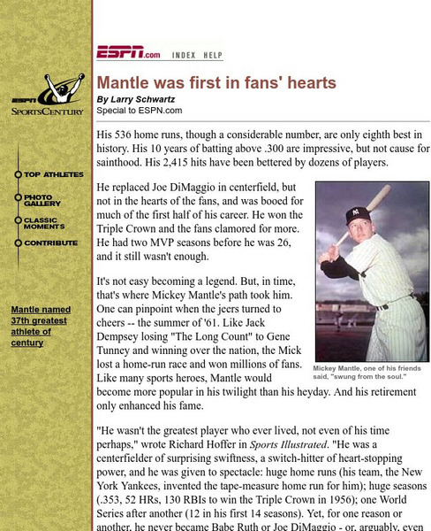 Espn: Mantle Was First in Fan's Hearts