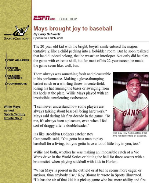 From ESPN, career and biographical highlights of legendary Giants outfielder, Willie Mays, who was named number eight on its list of greatest athletes of the 20th century.