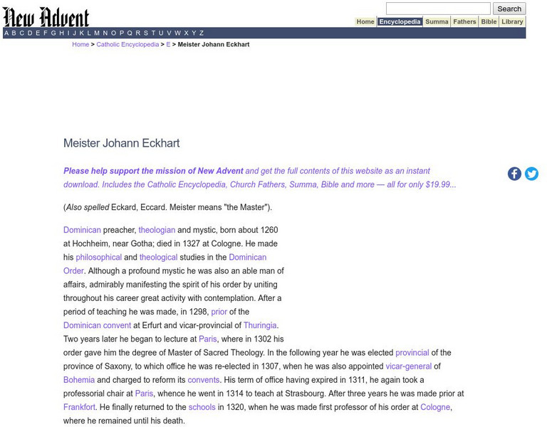 Written from a Catholic point of view, a biography of Meister Eckhart with numerous hotlinks to related topics. Please note that ?The Catholic Encyclopedia? is a historic reference source and should be viewed in the context of resource...