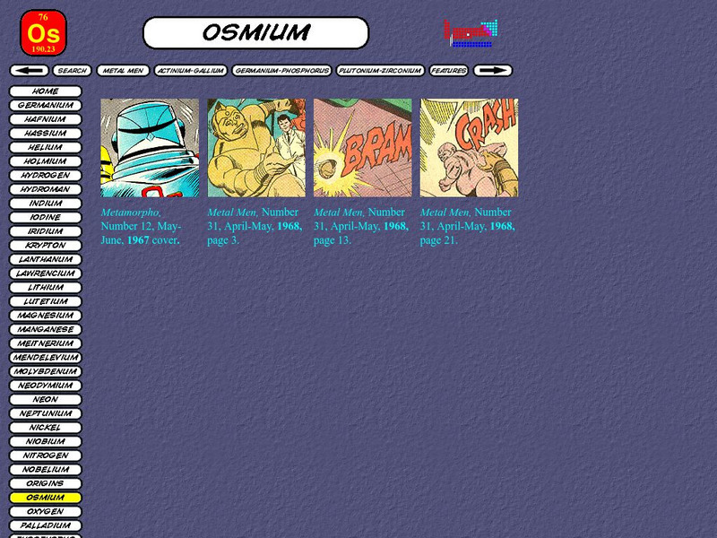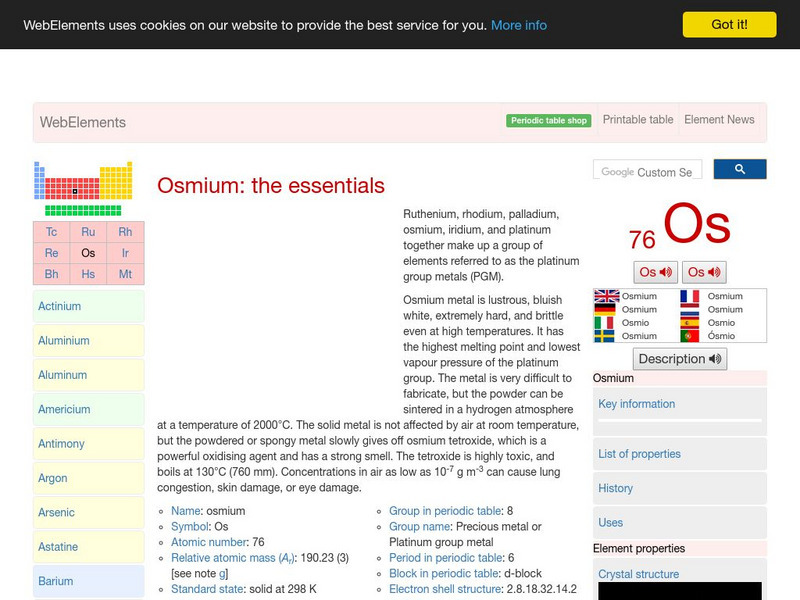 The ChemicalSociety provides a short entry with information on the history, description and uses of osmium.