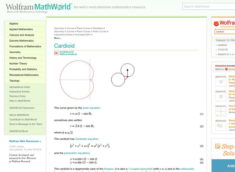 The site opens with a visual representation of how a Cardoid, a one-cusped epicycloid, is made. The site then shows the parametric, Cartesian, and polar equation for the special epicycloid. The last half of the page gives more equations...