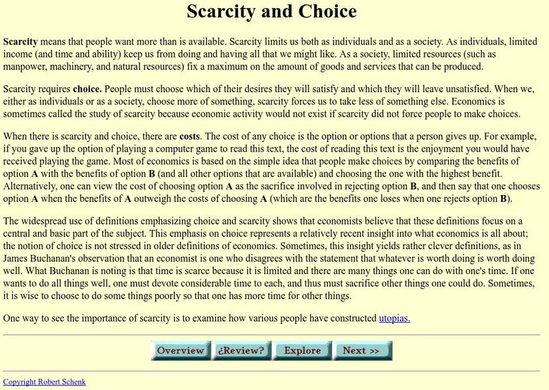 This site from the St. Joseph's College examines the importance of scarcity and choice in terms of an economic system. A further explanation explores how various people have constructed utopias to assume away the problem of scarcity.