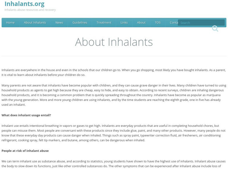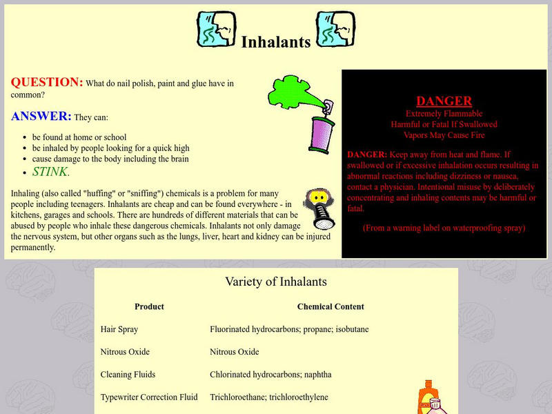 This website provides a very simple explanation of what inhalants are and how they harm the body. Included is a chart showing the names of abused inhalants that are common household items.