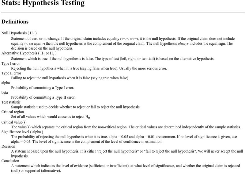 The necessary vocabulary from Richland Community College for statistical hypothesis testing is provided here. After viewing the vocabulary, click the link returning the user to the Table of Contents to see the rest of the Chapter 9 notes...
