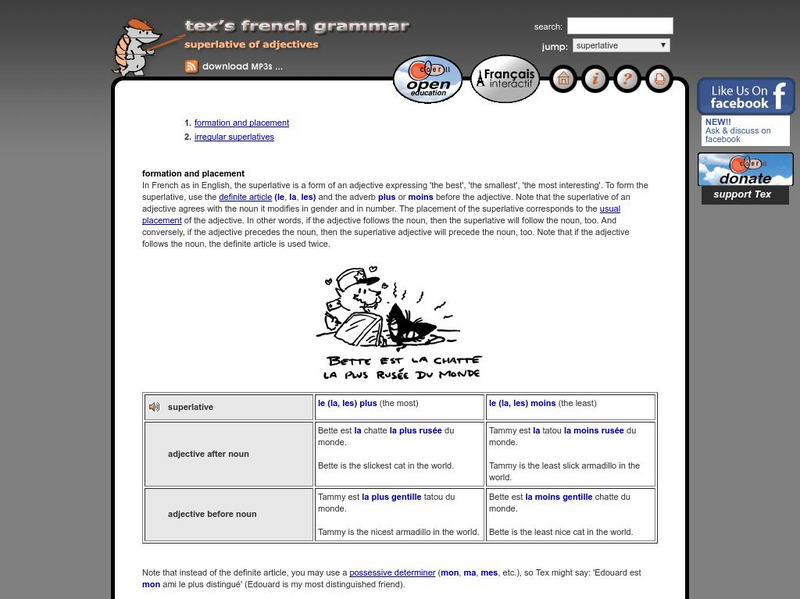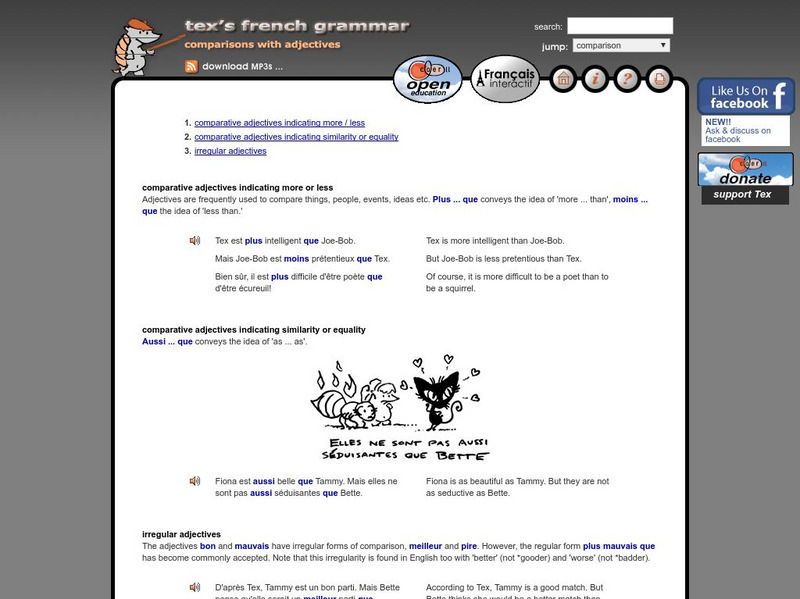 This site from Tex's French Grammar provides a succinct presentation of comparative adjectives (plus que, moins que, aussi que) and irregular adjectives (bon/meilleur, mauvais/pire). Provides usage examples, dialogues and interactive...