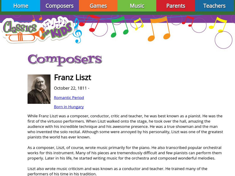 Classics For Kids provides a short biography of Romantic composer Franz Liszt, born on October 22, 1811.